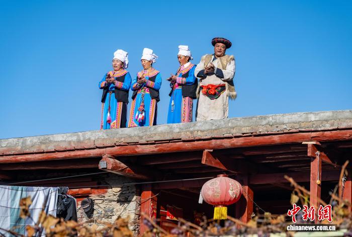 图为乌虎羌寨的羌族公众正在楼顶唱歌。韩金雨 摄